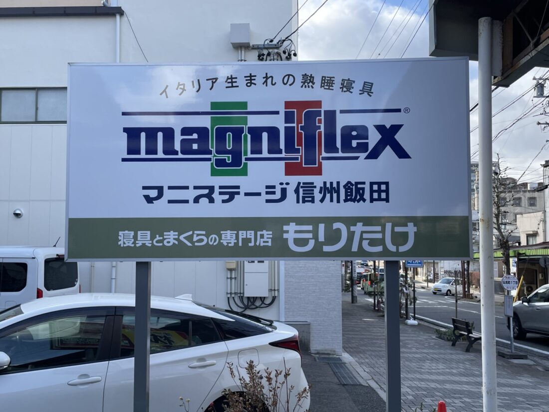 飯田市伝馬町にある、飯田の町のふとん屋さん。マニフレックスの大きな看板が目印で店舗横に駐車場をご用意していますのでお気軽お越しいただけます。